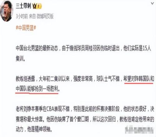 台北队教练喊出两场比赛希望能抢到一场胜利,他们不只是瞄准韩国队,同时也瞄准中国队。郭士强没有带上冲击力更强的庞峥麟,是一个失策。他得擦亮眼睛了,必须在比赛中用对人,用好人,再有闪失,输给台北并不奇怪,郭士强得小心了。你们说呢?