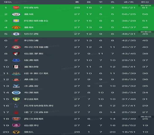 英超最新积分榜