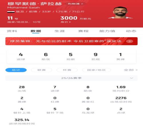 33岁的萨拉赫当前德转身价为3000万欧元,他与利物浦的合同将在2027年6月底到期。目前萨拉赫的税前周薪为40万英镑,排名英超第2,仅次于哈兰德。